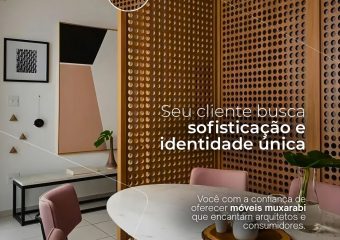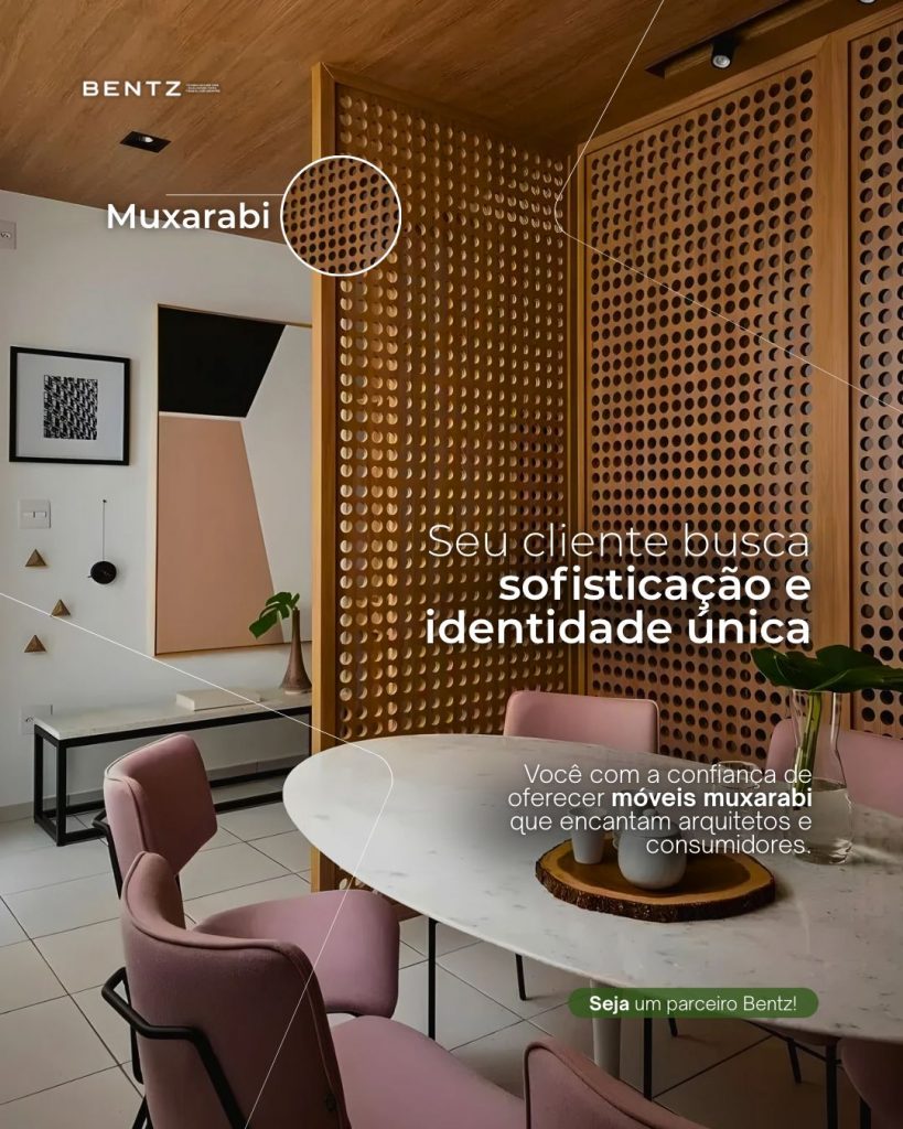 Muxarabi é uma usinagem especial de padrões no MDF com aberturas geométricas que permite a entrada de luz e ventilação, enquanto garante privacidade. É um elemento arquitetônico típico da arquitetura árabe e é muito comum no Oriente Médio.